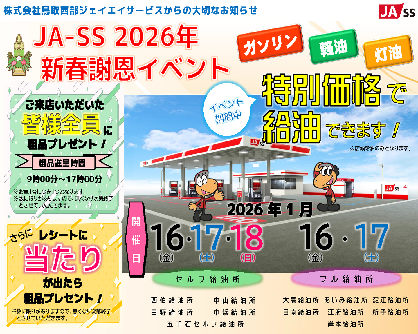 キャンペーン・イベント情報 いつも弊社のガソリンスタンド・LPガスをご利用いただき、誠にありがとうございます。当スタンド・営業所では、お客様への感謝の気持ちを込めて、定期的にお得なキャンペーンや楽しいイベントを実施しております。ここでは、最新のキャンペーン情報やイベントの詳細をご紹介いたしますので、ぜひご覧ください。皆様のご参加を心よりお待ちしております。 イベント 新年のご挨拶と新春謝恩イベントのお知らせ.pdf 【チラシ】 新春謝恩イベント.pdf キャンペーン