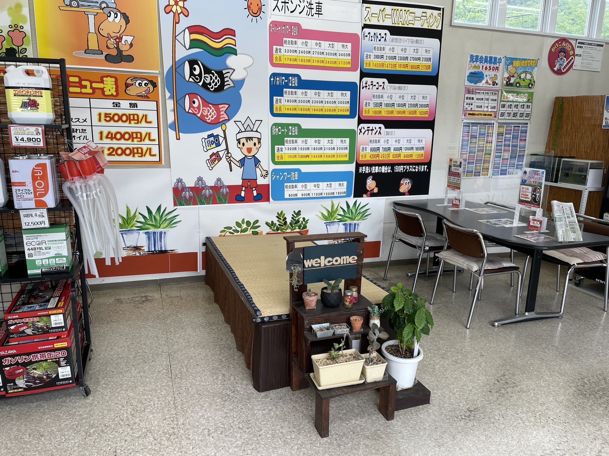 | 取扱い内容 | オイル・タイヤ・バッテリー交換 タイヤ組換え、バランス調整、廃タイヤ引き取り 車内清掃、固定掃除機あり、オイル添加剤販売 バッテリーあがり救援、パンク救援 灯油・軽油配送(曜日指定による配達料割引あり) |