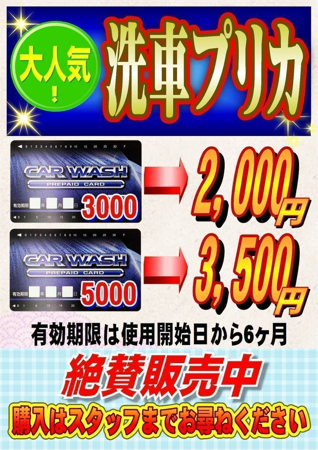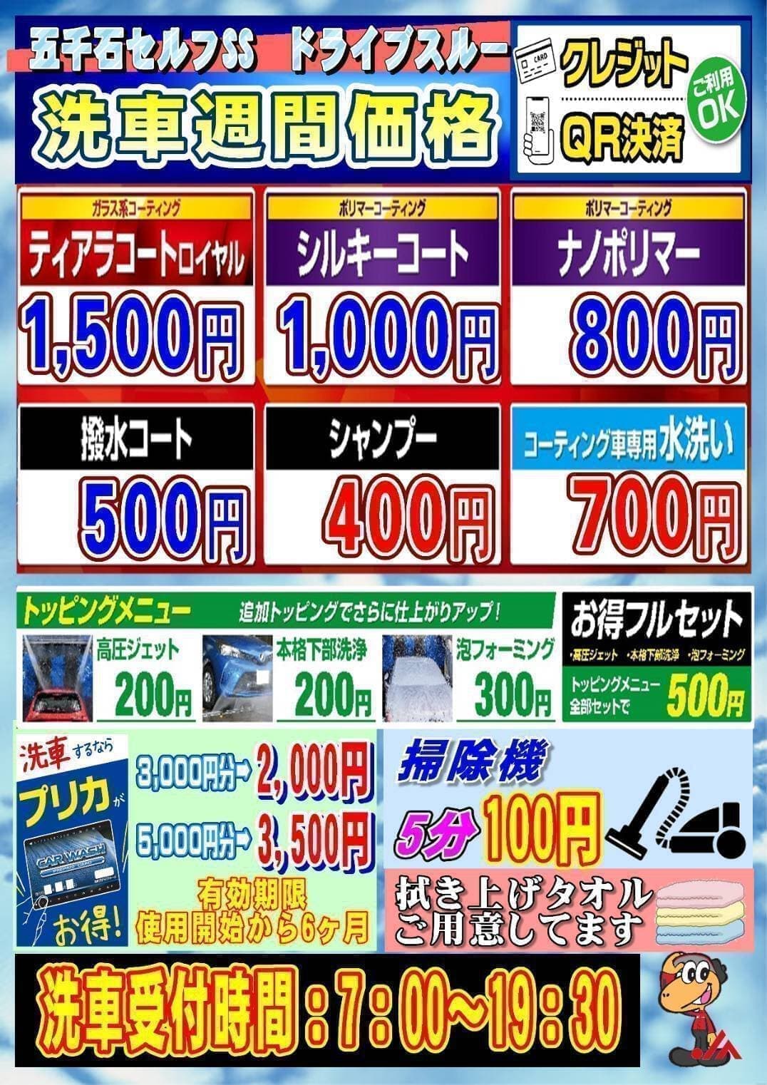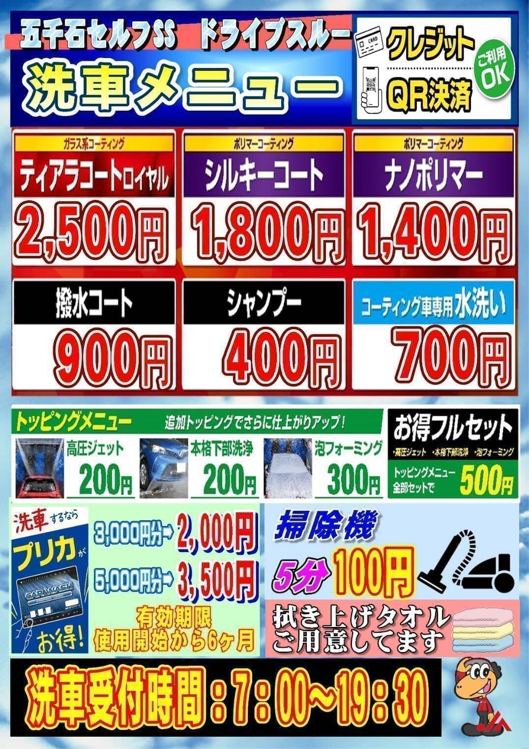 | セルフ洗車受付時間 | 7:00~19:30 預かり洗車無し |
