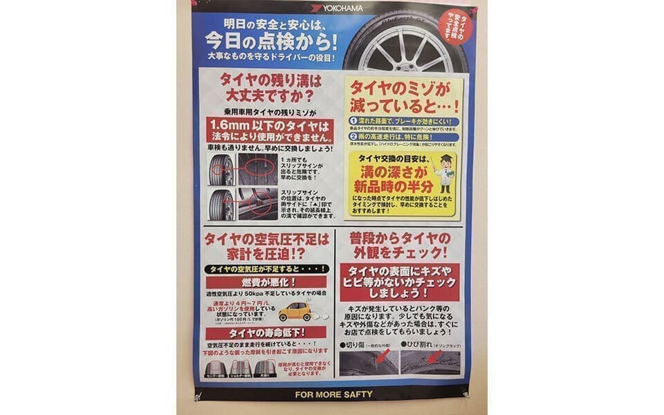 | 取扱い内容 | エアコンガス交換(車種により対応不可有り) タイヤ・オイル・バッテリー交換 タイヤ組換え・ローテーション パンク修理、バランス調整、廃タイヤ引き取り ライト・電球交換、混合油販売 マット洗機有り、固定掃除機有り オイル添加剤・プリペイドカード販売(クオカード) |