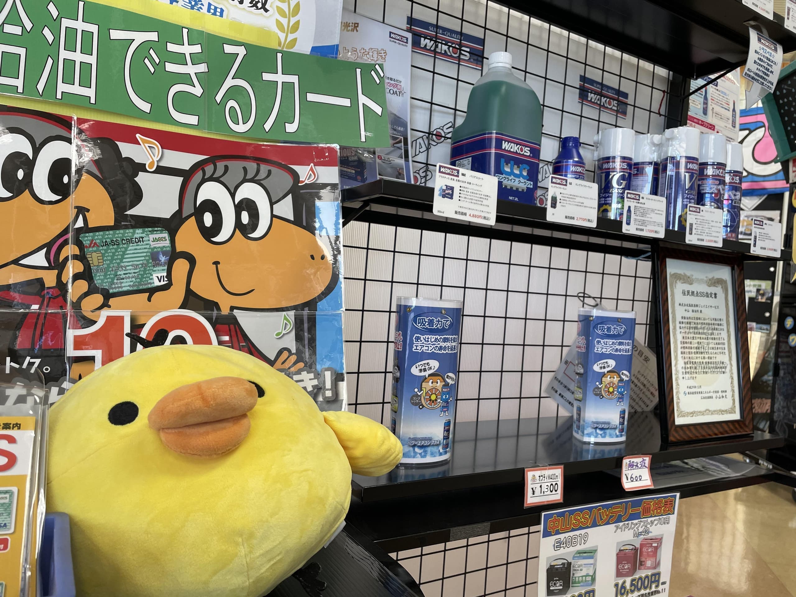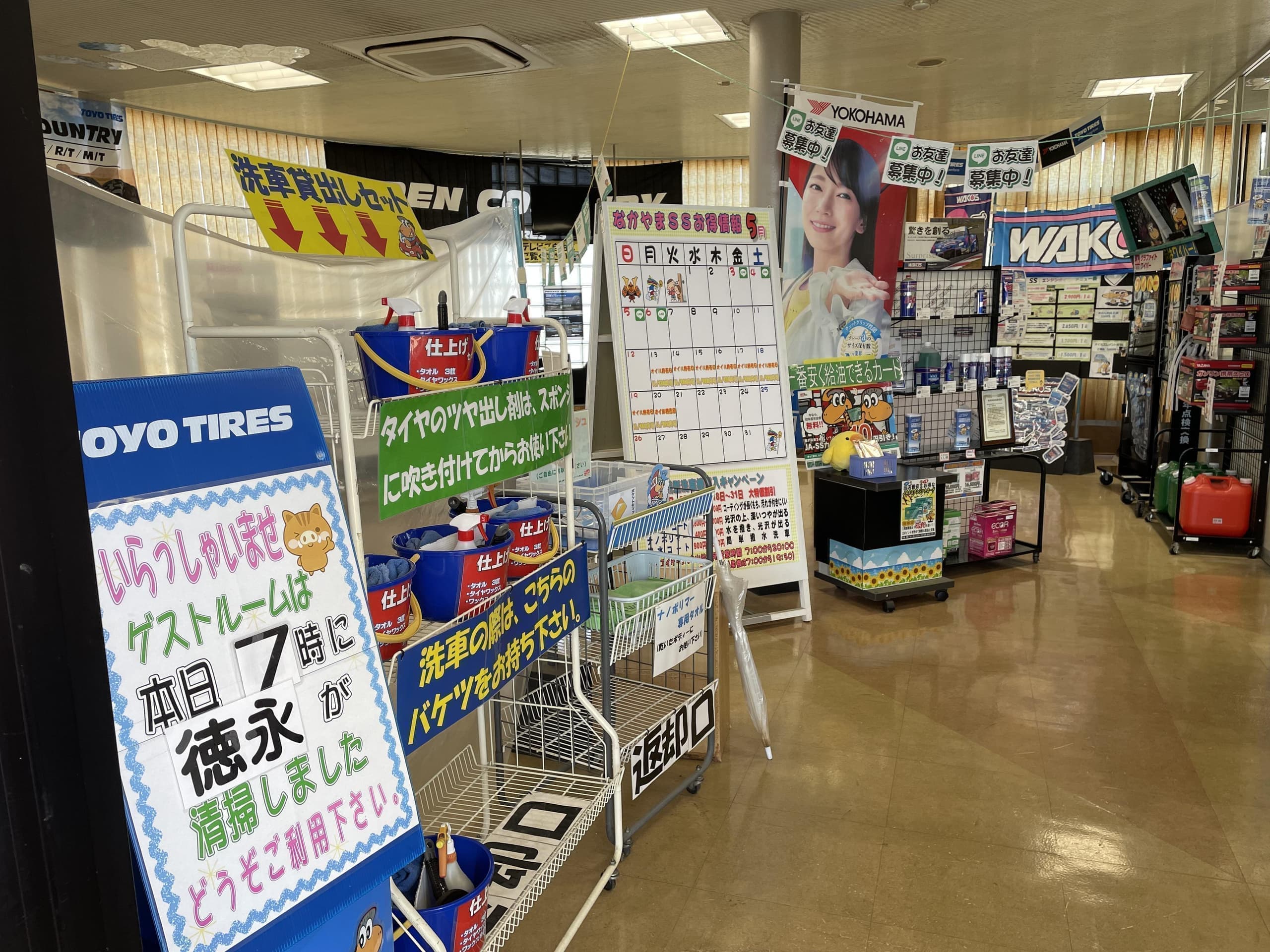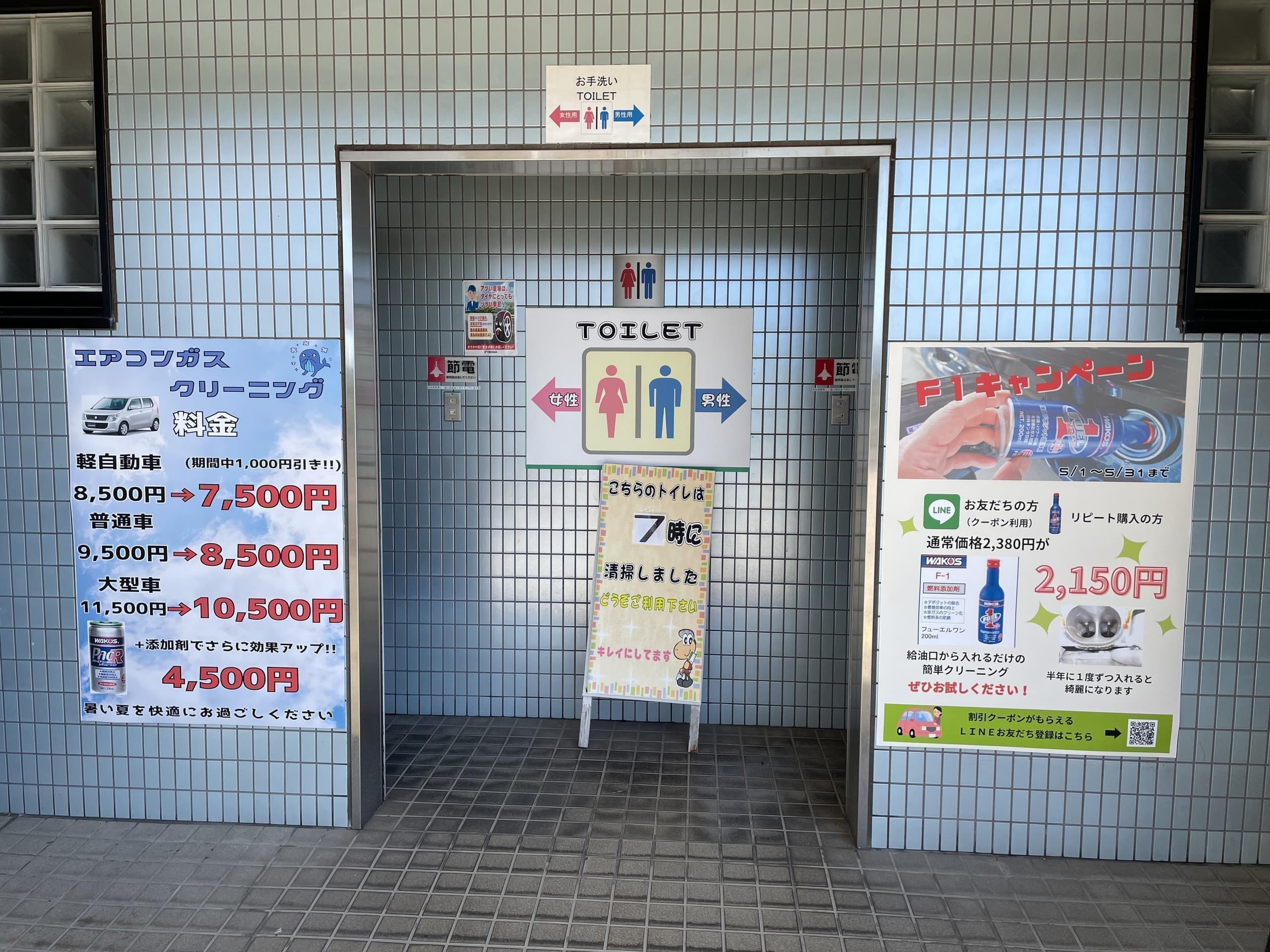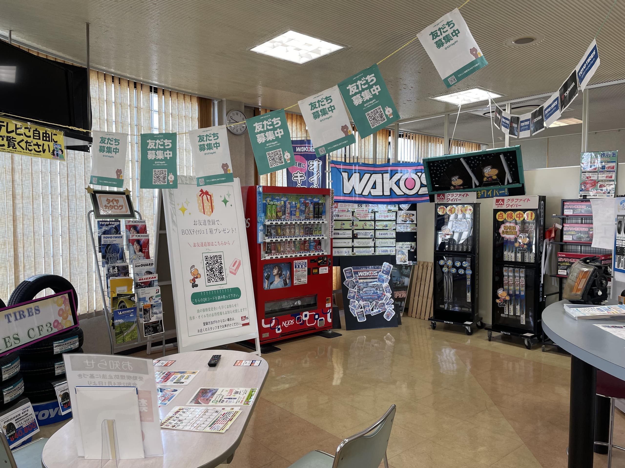 | 取扱い内容 | エアコンガス交換(車種により対応不可有り) タイヤ・オイル・バッテリー交換 タイヤ組換え、バランス調整、廃タイヤ引き取り マット洗機有り、固定掃除機有り オイル添加剤・プリペイドカード販売(クオカード) |