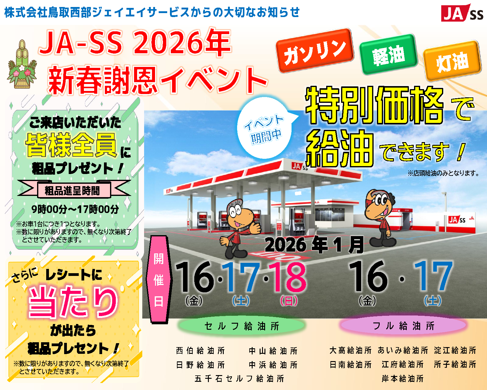 キャンペーン・イベント情報 いつも弊社のガソリンスタンド・LPガスをご利用いただき、誠にありがとうございます。当スタンド・営業所では、お客様への感謝の気持ちを込めて、定期的にお得なキャンペーンや楽しいイベントを実施しております。ここでは、最新のキャンペーン情報やイベントの詳細をご紹介いたしますので、ぜひご覧ください。皆様のご参加を心よりお待ちしております。 イベント 新年のご挨拶と新春謝恩イベントのお知らせ.pdf 【チラシ】 新春謝恩イベント.pdf キャンペーン