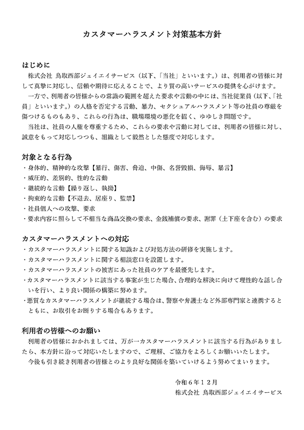 株式会社 鳥取西部ジェイエイサービス(以下、 「当社」といいます。 )は、利用者の皆様に対して真摯に対応し、信頼や期待に応えることで、より質の高いサービスの提供を心がけます。