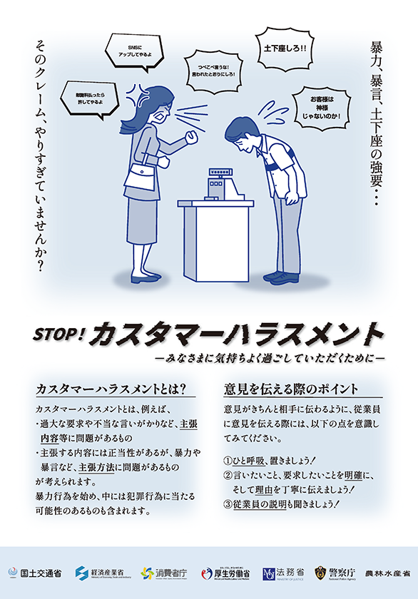 利用者の皆様におかれましては、万が一カスタマーハラスメントに該当する行為がありましたら、本方針に沿って対応いたしますので、ご理解、ご協力をよろしくお願いいたします。