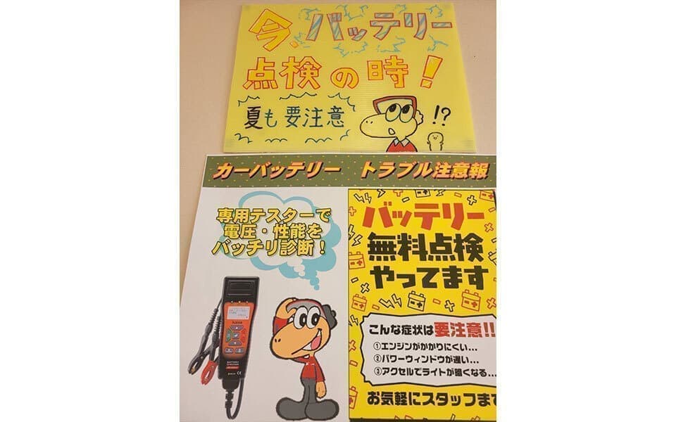 | 取扱い内容 | エアコンガス交換(車種により対応不可有り) タイヤ・オイル・バッテリー交換 タイヤ組換え・ローテーション パンク修理、バランス調整、廃タイヤ引き取り ライト・電球交換、混合油販売 マット洗機有り、固定掃除機有り オイル添加剤・プリペイドカード販売(クオカード) |