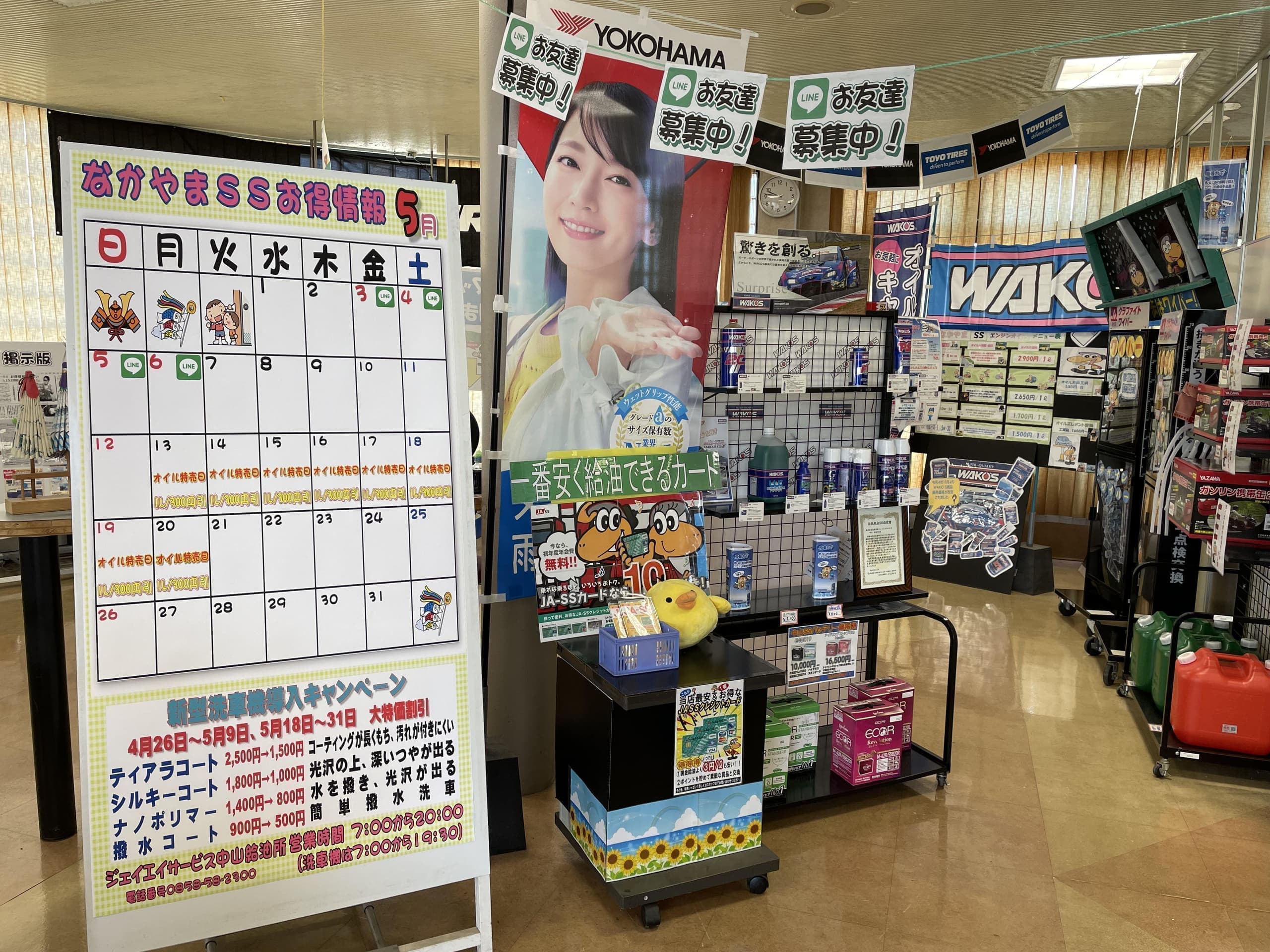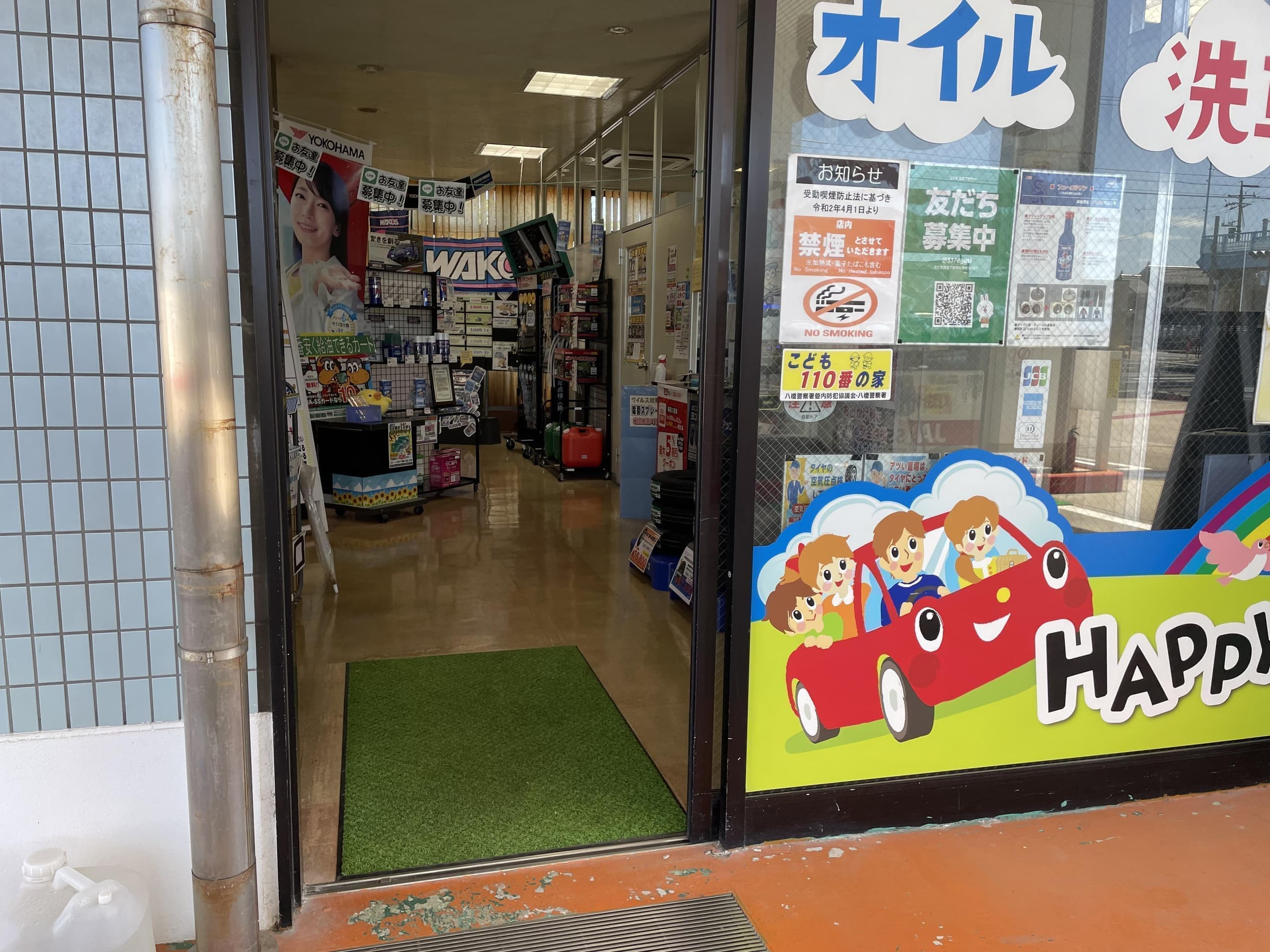 | 取扱い内容 | エアコンガス交換(車種により対応不可有り) タイヤ・オイル・バッテリー交換 タイヤ組換え、バランス調整、廃タイヤ引き取り マット洗機有り、固定掃除機有り オイル添加剤・プリペイドカード販売(クオカード) |