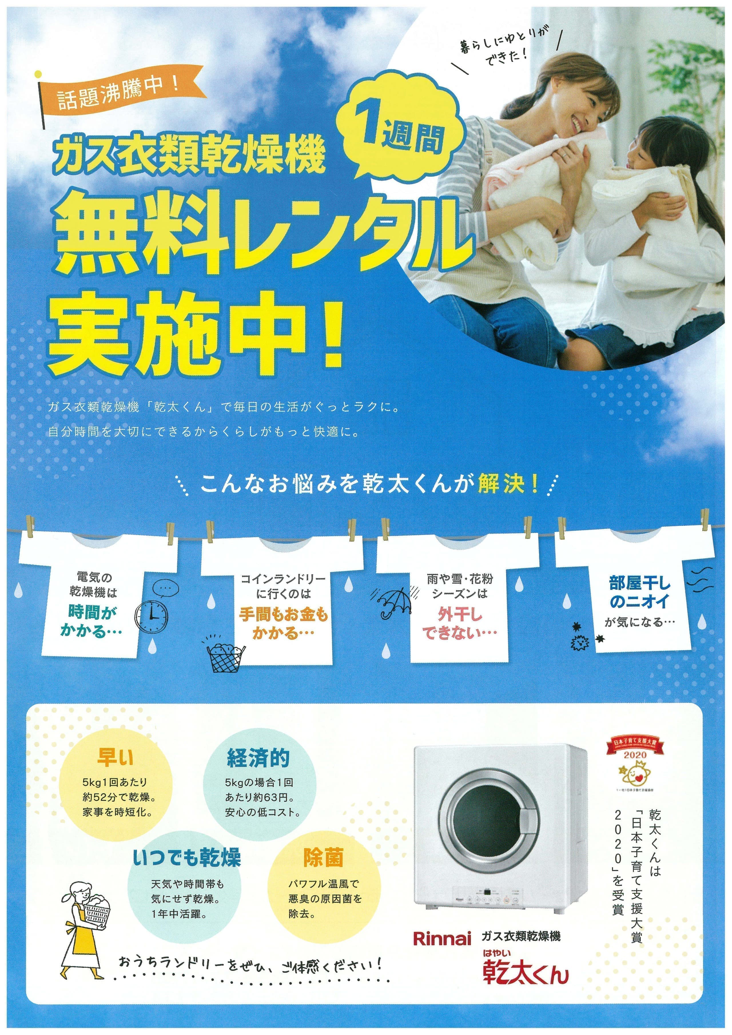 LPガスの衣類乾燥機を一週間無料でお試しいただける特別キャンペーンを実施しております。